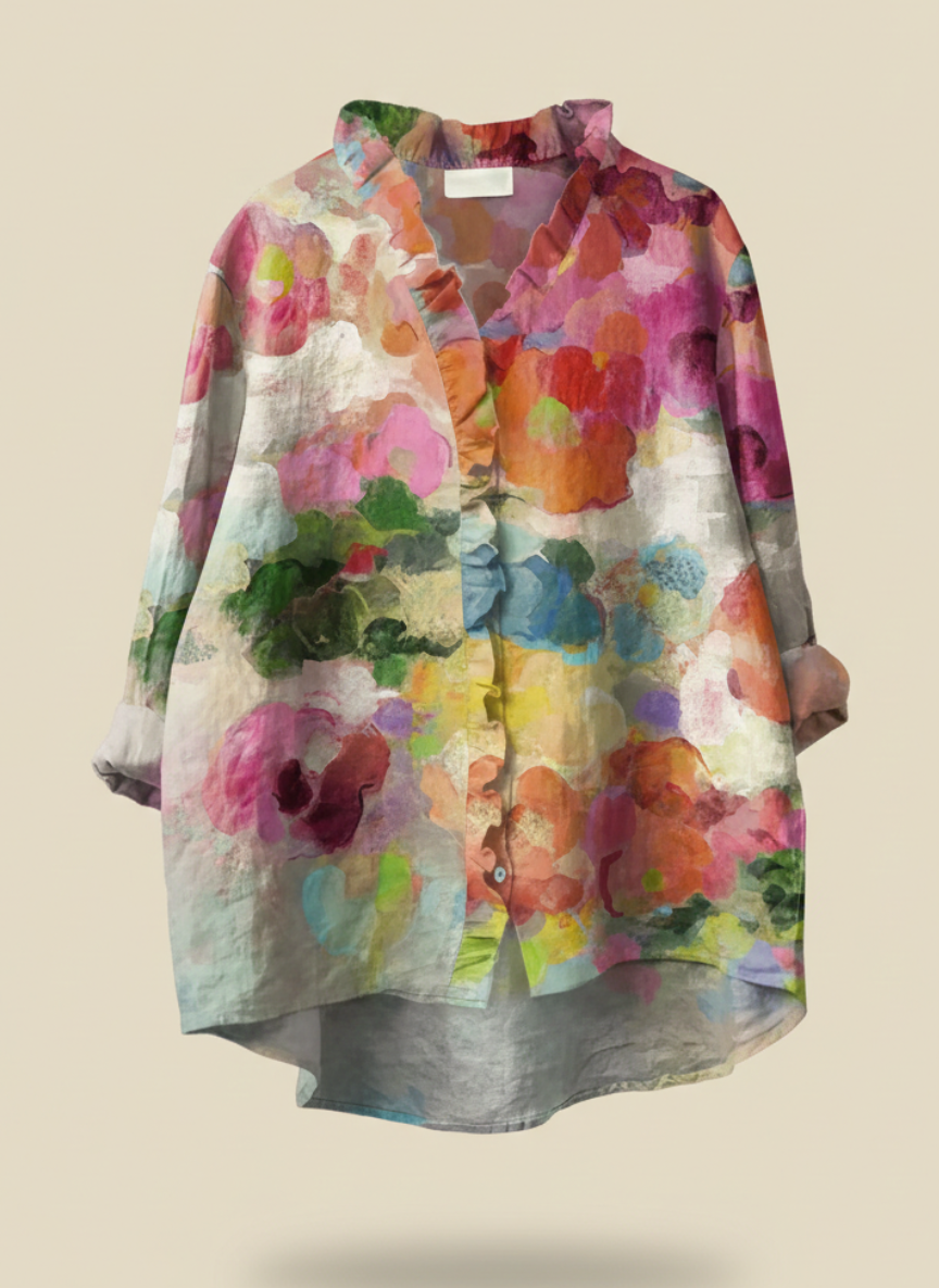 Women's Vintage Flowers Art Print Casual Cotton And Linen Ruffle Shirt