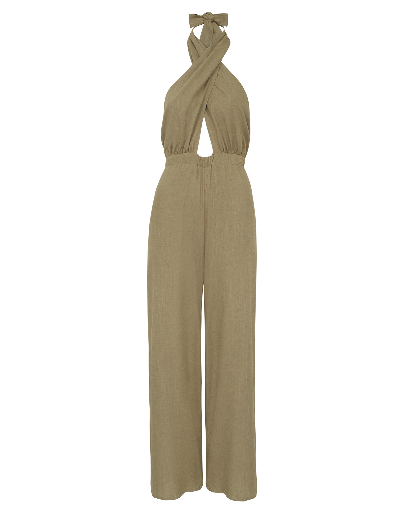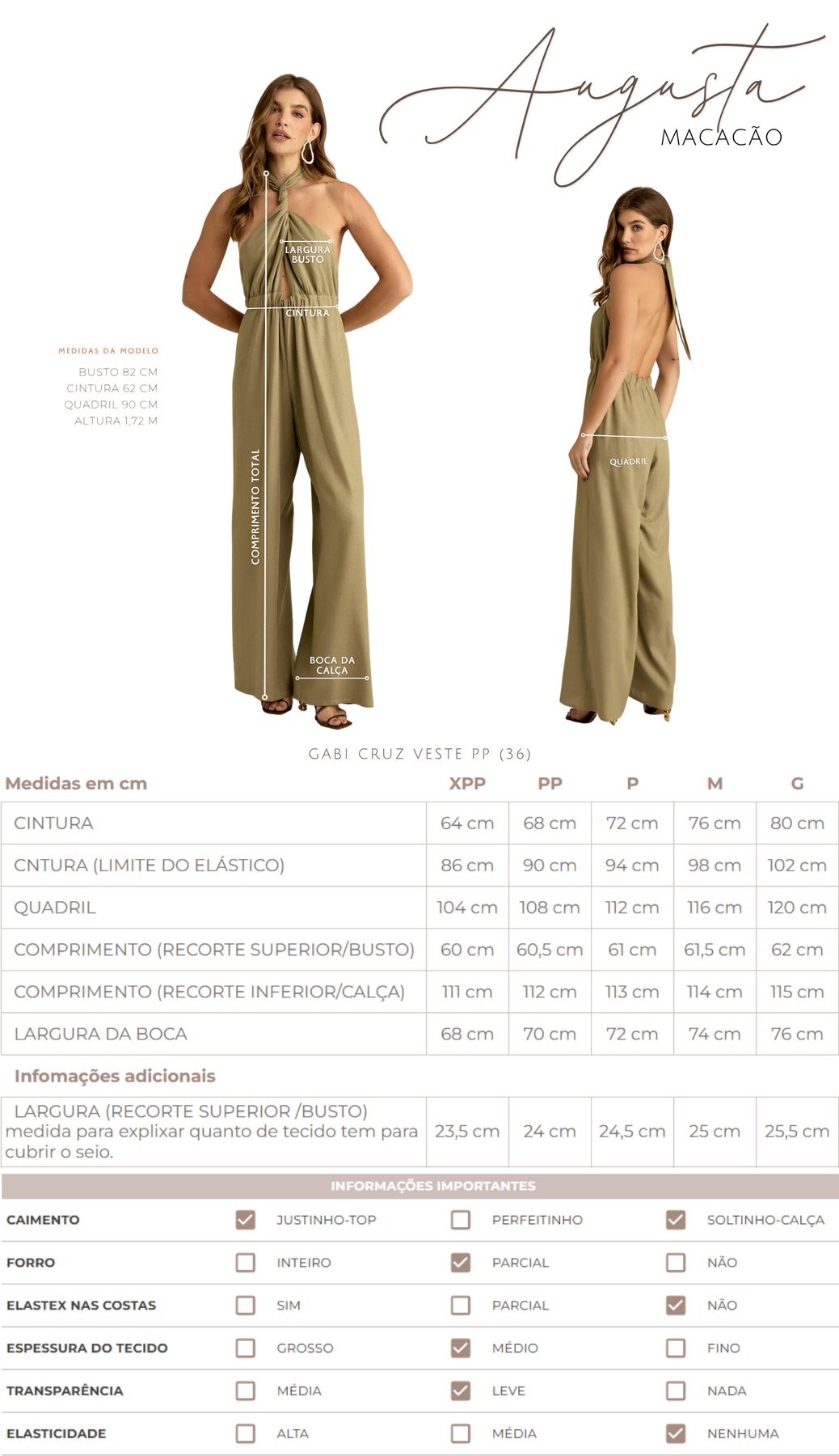 Macacão confeccionado em linho. Possui forro na parte de baixo, tecido duplo no busto para não ficar transparente, modelagem frente única com duas faixas fixas compridas que saem da cintura para amarrar e fechar o decote, permitindo diversos tipos de amarração diferentes; conta com elástico franzido na cintura e fechamento traseiro na calça por zíper invisível.