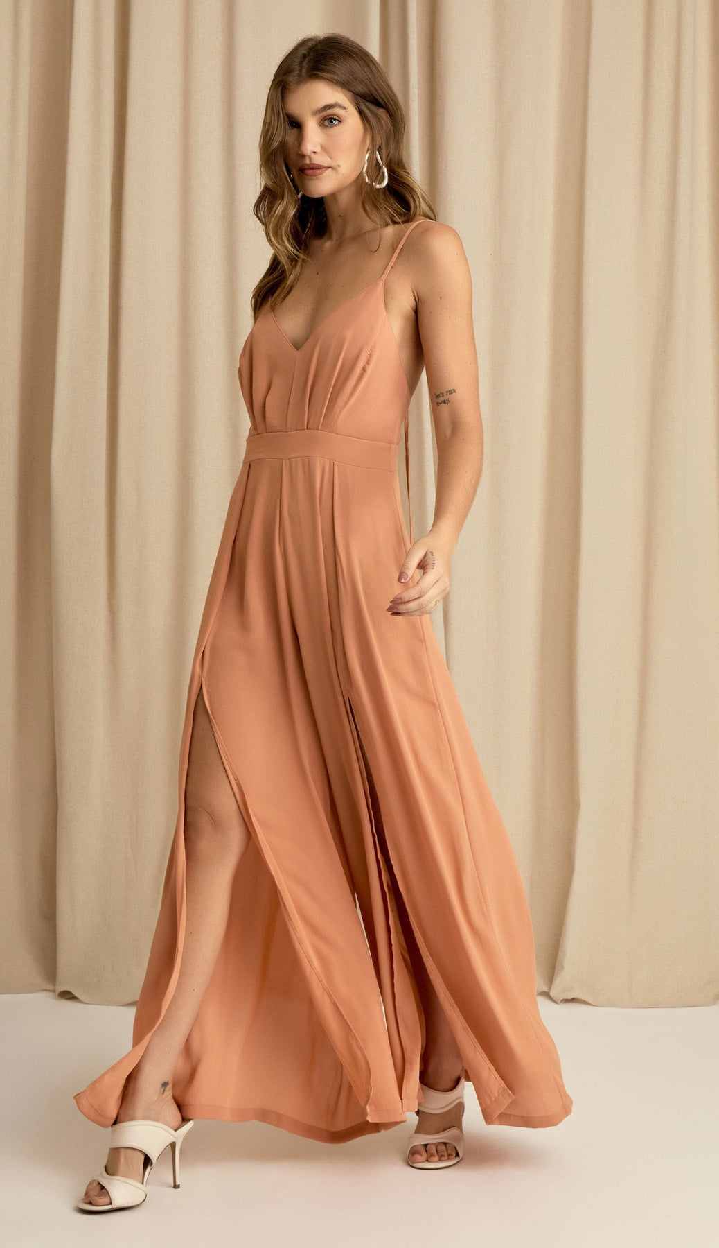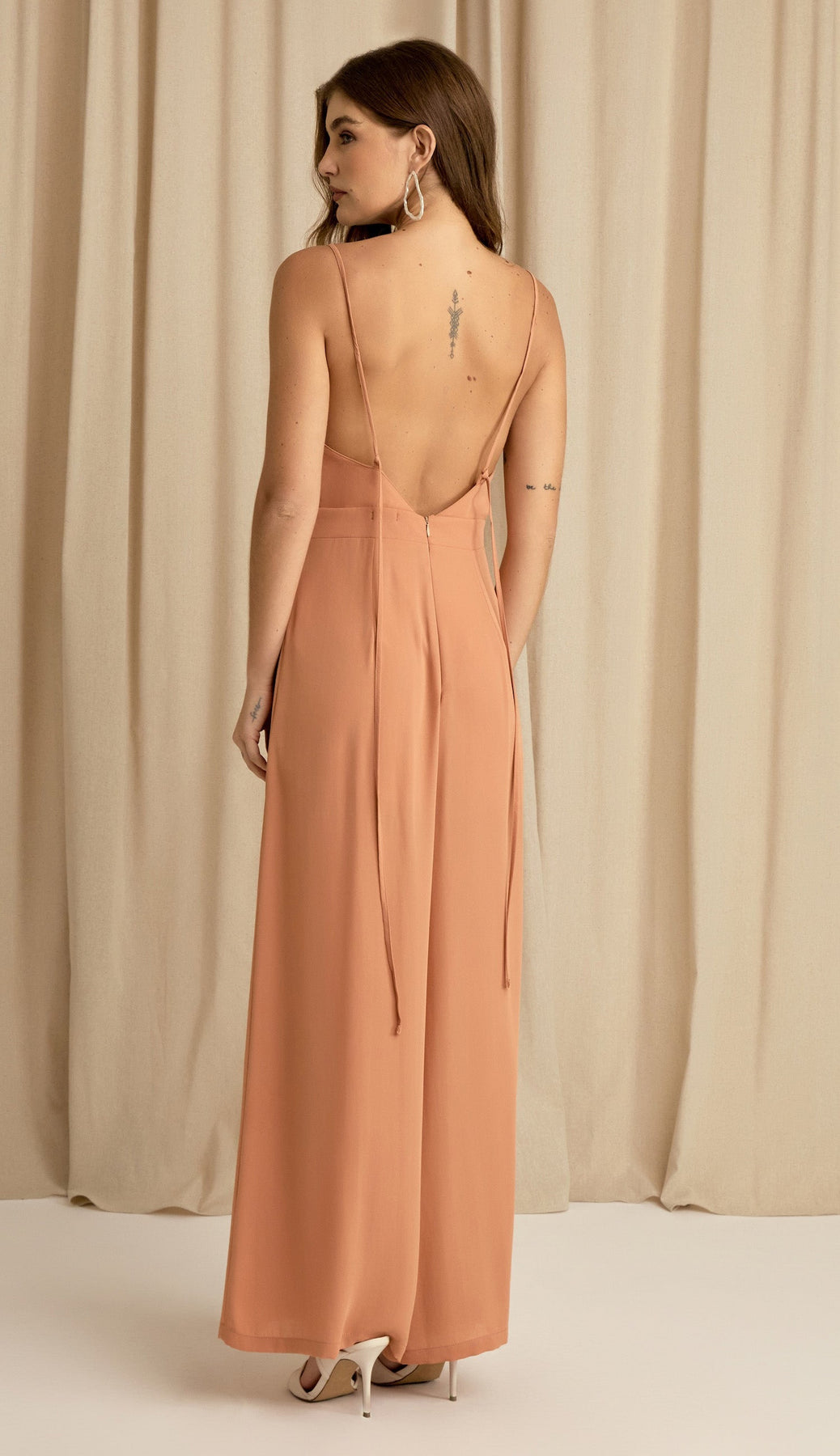 A wide-leg jumpsuit crafted from crepe with full lining. It features a flattering V-neckline, long adjustable straps that tie at the back, and a bodice with cut-out detailing and soft pleats. The design continues with a structured waistband and delicate pleats along the legs, finished with elegant front slits. The back closes with an invisible zipper for a clean, refined look.